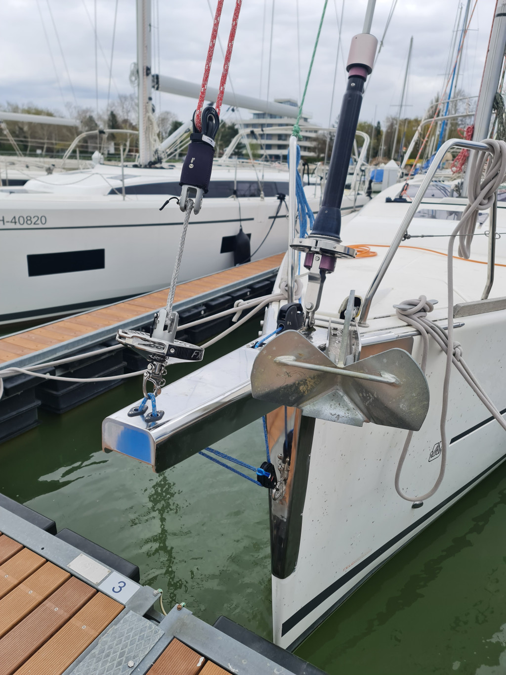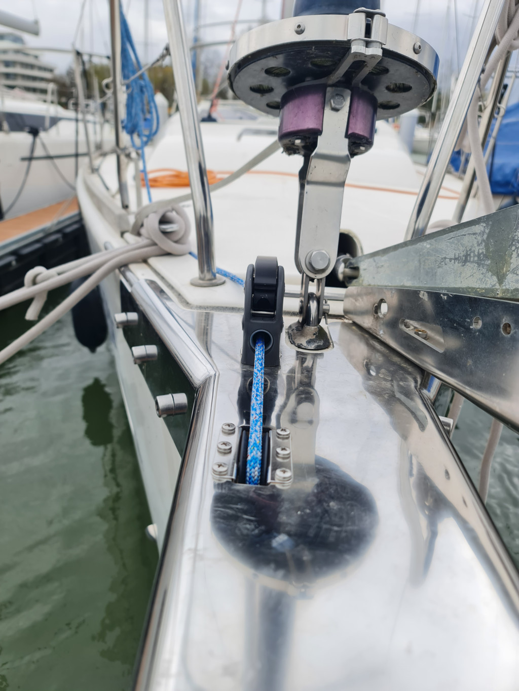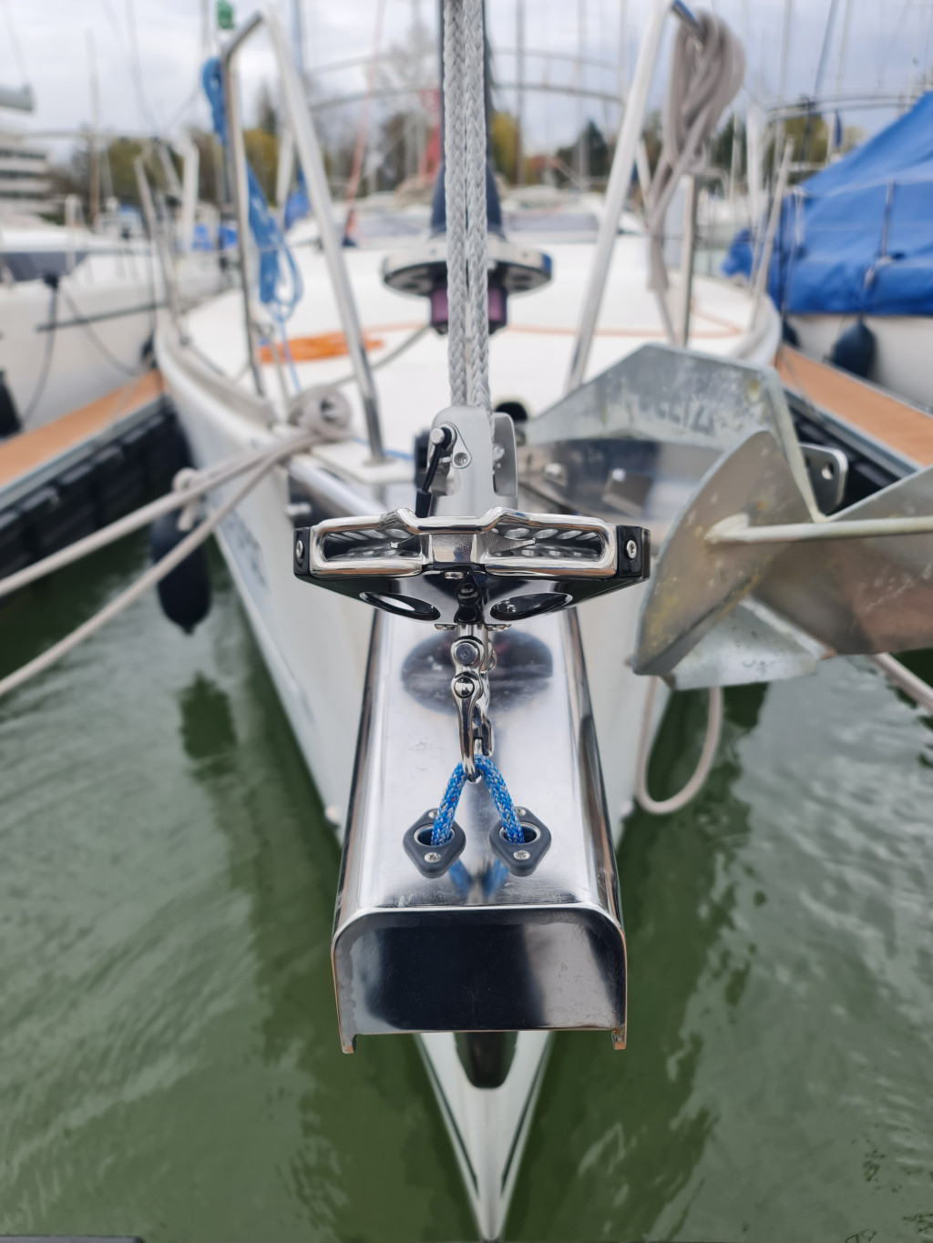 Ez az általunk tervezett és egyedileg gyártott fix orrsudár alkalmas nagyméretű genakkerek és Code 0 vitorlák bekötésére. Az orrtőkéhez 2:1 áttételű Dyneema kötél feszíti, mely egyúttal a vitorla alsó bekötési pontját is tartja. A feszítőkötelet fallstopper rögzíti.